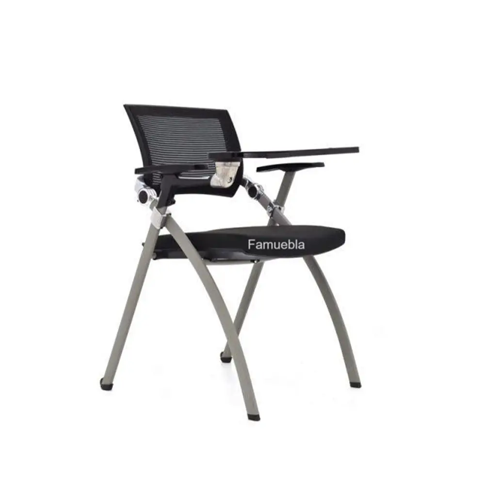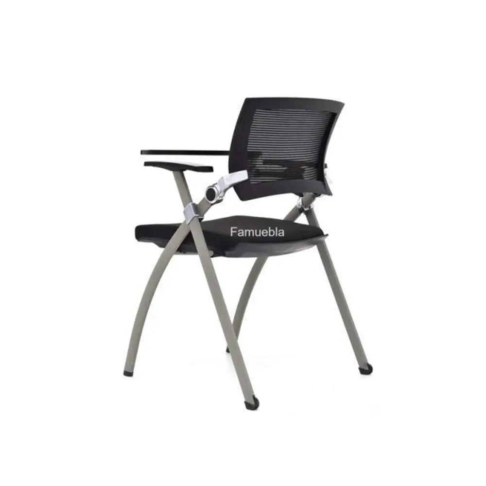 - Asiento práctico: Inyectado y tapizado en tela negra, incluye un diseño rebatible para facilitar el apilado horizontal de las sillas.